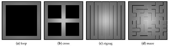 Inspired by the RoboCup Rescue competition, four experimental terrains (see Figure 4) were created with the same size but different topological structures (i.e., explorable areas):