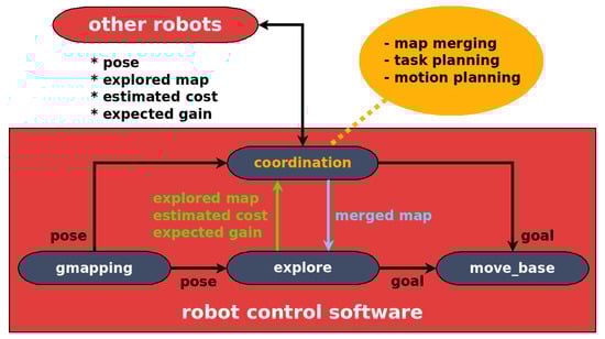 - coordination was developed as an abstract interface to the testbed. Users can implement their own coordination strategies such as map merging (http://wiki.ros.org/map_merging), task planning and motion planning. In our case, it provides the merged map to the explore package and the frontier position to the move_base package.