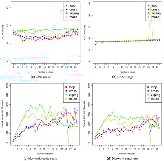 We therefore propose to measure the CPU and RAM usages as well as network transmission rate on the simulated robot, among which the CPU usage is the sum of user and system CPU times, the RAM usage is the percentage of memory in use, and the network transmission rate is the total number of kilobytes received/transmitted per second.