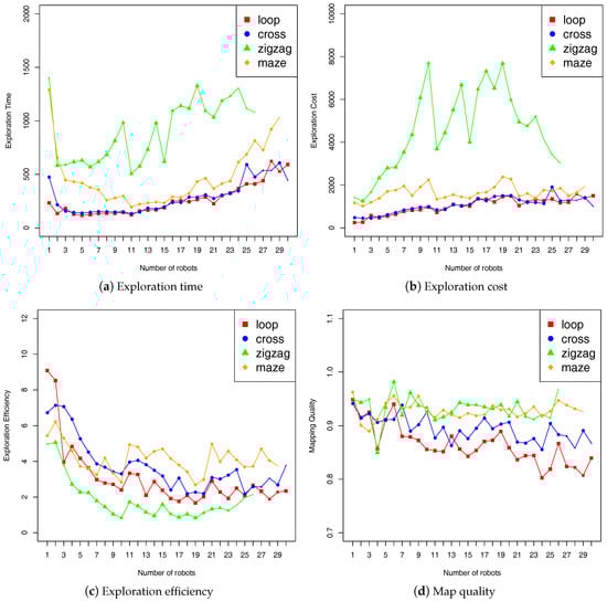 Figure 7 shows the measurements by using the “fleet” metrics as described in Section 3.3.2. We performed 5 runs for each fleet size, and display the mean value of these runs. The symbol size of the mean value in the plots varies with the number of success runs (i.e., 1 to 5), and it will not be displayed if all 5 runs fail. It can be seen that system performance is the lowest with the zigzag terrain. Our experiments showed that exploration was mainly performed by a single robot in this terrain, because there is only one frontier which is always the closest to the same robot (i.e., the one at the top left corner of the terrain). In addition, the optimal fleet size of the robots can be assessed according to these benchmarking results. For example, to explore the maze terrain the ideal fleet should have 11 robots, with which we can get less exploration time and cost while ensuring high exploration efficiency.