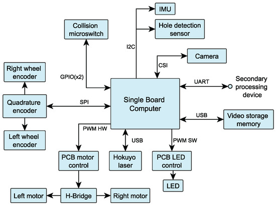 Since the adopted SBC (i.e., Raspberry Pi) lacks analog interfaces, there is a micro-controller-based board (Arduino Trinket Pro) that controls the servo motor connected to the robot’s sweeping arm by means of a PWM signal and that reads the signals of the analog sensors. Figure 3 shows a block schema describing how the Trinket Pro (indicated as the secondary processing device) is connected to the SBC and other analog interfaces.