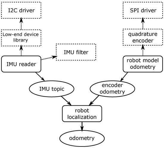 Acceleration and angular velocity are read by imu_reader and transferred to the SBC via I2C. The data are filtered by imu_filter, before being published on the /imu topic. Data from the encoders are received by the robot_odom node from the quadrature_encoder node, which in turn exploits the spi_driver to communicate with the quadrature encoder hardware device.