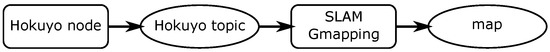 The SLAM operation is performed by the slam_gmapping node, which is fed by ranging information from the Hokuyo laser scanner and odometry information from the sensors data that robot_localization combines. As the robot moves in the duct environment, a 2D occupancy grid map is generated by slam_gmapping, which can later be exported in a suitable image format after the exploration is complete. Since the map creation and storage are handled by ROS, partial maps of the already performed exploration are available in case of emergencies where the robot stops or shuts down arbitrarily. To read raw laser scans, the hokuyo node performs periodic reads from the Hokuyo laser scanner and publishes ranging information to the hokuyo topic, which is consumed by slam_gmapping. The latter in turn generates the map and publishes the /map topic. Figure 6 shows the components of the mapping framework and how they are connected. The odometry topic depicted in Figure 5 is also fed into the slam_gmapping node to be integrated with other sensory information.