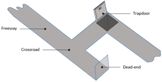 Example of an environment with obstacles. From left to right: horizontally-suspended obstacle, short obstacle and a trapdoor.