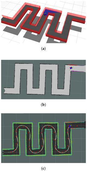 Exploration and mapping of a simple duct. Both maps—SLAM map and costmap—were generated concurrently: (a) simple duct environment with walls depicted by transparent red barriers; (b) map generated using SLAM by the slam_gmapping node; (c) global costmap generated by the ROS navigation stack.