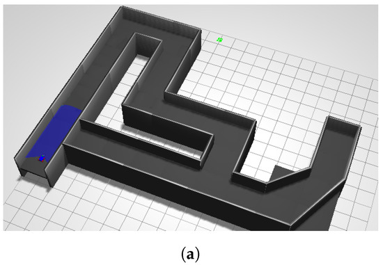 Several tests were also carried out on the suitability and the effectiveness of the navigation algorithm. Two examples of the execution of the exploration task are reported. Figure 11 shows the behavior in a relatively simple environment, without obstacles and branches. Afterwards, a more advanced duct environment is considered, having typical features of a real ventilation duct such as the crossroad and dead-end shown in Figure 12a. The simulation environments were created in the Gazebo simulator, while the maps were taken from the ROS RVIZ (Robot Visualization tool). Holes were not included in the environment since the default action after detecting a hole is to terminate the pursuit of the current goal point, push the goal point off the stack and then pursue the topmost (or next) available goal position in the stack. Mapping results for two duct environments are shown in Figure 11 and Figure 12. The red markers are goal points selected by the navigation algorithm in use. The lines trailing the robot were traced from these markers, and they indicate the robot path. In both cases, the robot succeeds in fully exploring the environment, building a reliable map of the unknown area.