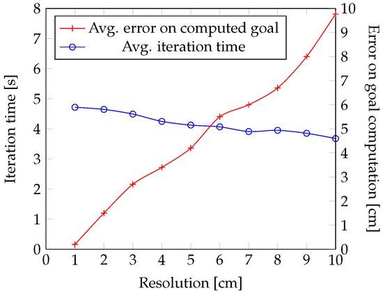 Since the value of the costmap resolution is not fixed and should be selected by the user, to ease the selection of a suitable costmap resolution, more experimental results are provided in Figure 13 showing two graphs. The first graph in blue shows the average iteration/exploration time (i.e., time for goal computation plus robot transit time to reach the goal) against costmap resolution. The second graph in red shows the average error on reaching the computed goal against costmap resolution.