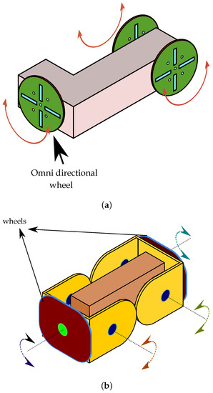 M3 [25] modular robot is an L-shaped robot equipped with three wheels (one omnidirectional and two regular wheels) that are capable of supporting mobility as well as the formation of structures. Each wheel as shown in Figure 1a supports mobility and consists of sockets for docking with neighboring robotic modules. The wheels also aid in rotation and lifting after successful docking. M3 robotic module is prototyped in 2010 and it employs hooks for the sake of genderless docking. MExpress [26] prototyped in 2012 is morphologically similar to M robotic module and it employs internal magnets coupled with slip rings that control the position of magnets for docking and undocking.