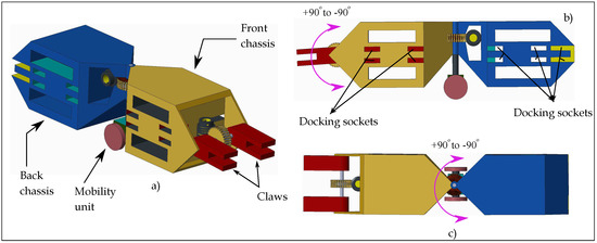 The HexaMob robotic module is designed to support the formation of chain and biomimetic structures in 2D and 3D. The hybrid category design of HexaMob along with its mobility support makes it a viable testbed for research in modular robotics. The design of HexaMob robotic module is shown in Figure 2. HexaMob robotic module is an assembly of three separate sections—Front chassis, Back chassis, and Mobility unit. The front chassis is equipped with two claws rotated by a common shaft and rotation of the shaft is sourced by a worm-gear present in front chassis. The claws are capable of positioning robotic modules mounted on them from vertically upwards (90) to vertically downwards (−90). The Front chassis also consists of docking sockets on the side faces for forming different structures. The back chassis consists of three docking faces including a face at the back along with sockets on side faces. A second worm gear mechanism is present at the center of the assembly of front and back chassis facilitating rotation around a vertical axis via a hinge mechanism. The DC motor and worm necessary for controlling the worm-gear present at the center of assembly are mounted in back chassis.