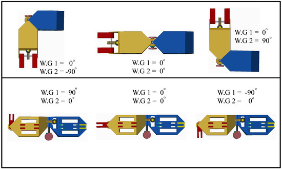 The designs of the front/back chassis is made to resemble hexagon structure both in the top and side views so that stresses on claws can be minimized in few chain structures. The robotic modules mount on chassis of each other at extreme angles of rotation and hence reducing the stresses on claws/hinges as proposed in [48]. The hinge mechanism coupled with worm-gear system present at the center of assembly provides precise control in navigation, docking and degrees of freedom for HexaMob during formation of various structures. The orientations possible with a single HexaMob robotic module upon activation of two worm gears (W.G 1 at the front and W.G 2 at the center) are shown in Figure 3.