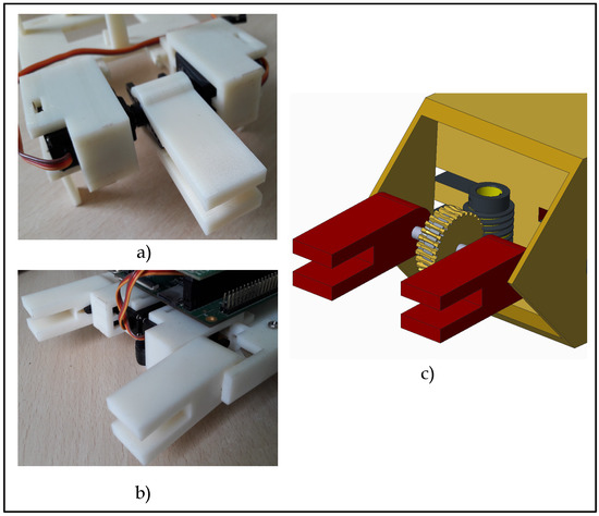 Docking Prototypes. (a) Single claw—double servo; (b) Double claw—double servo; (c) Double claw—Worm gear.