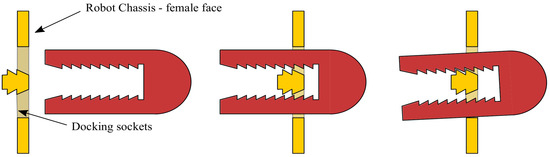 The teeth together with thin films of Velcros (not shown in Figure 5) placed on the claw and sockets can provide a firm binding during docking and locomotion for lighter loads. Since the twin claw mechanism is sourced using an enveloping worm gear as shown in Figure 4c and docking can be implemented without using energy, the HexaMob robotic module with its back-driving restriction capabilities from worm-gear maintains the structures with zero energy consumption.