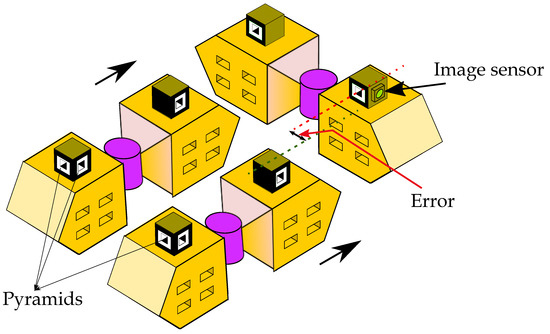 The Vision system is a guidance mechanism for docking and navigation of HexaMob robotic modules. Unlike conventional modular designs, HexaMob design aims to inculcate a lightweight embedded electronic platform capable of assisting in docking and navigation using vision sensor into the mechanical structure similar to the trimobot robotic module. The concept of docking when the robotic modules are in proximity to each other was explored rigorously by the employment of IR sensors [18,39,49] and magnets [50,51] in the domain of modular robotics and success of such docking process is also limited to few orientations of robotic modules with respect to each other. Vision sensors aids in overcoming major limitations in autonomous docking during reconfiguration in both 2D and 3D scenarios and also automating the aggregation and dispersion processes. The major requirements of the modular robotics electronic platforms such as low power consumption, various power modes and reactiveness along with image processing capabilities are fulfilled by FlexEye platform proposed in [52] and the same platform is utilized (without transceiver) for identifying the error in alignment process during docking. The vision sensor recognizes an area of interest and calculates the alignment error between male and female interfaces with respect to its camera axis as shown in Figure 7.