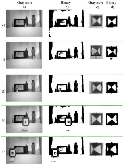 (a) Acquired images (b) Binary images from image processing (c) Acquired high resolution images of pyramid for further analysis (d) High resolution binary images of pyramid from image processing (e) Scenario with target object aligned with vertical axis of vision sensor and placed at 65 cm distance from camera module (f) Scenario with target object to the right of vertical axis of vision sensor and on horizontal line normal to vertical axis drawn at a distance of 65 cm from sensor (g) Scenario with target object to the left of vertical axis of vision sensor and on horizontal line normal to vertical axis drawn at a distance of 65 cm from sensor (h) Scenario with target object at center of camera axis and on a perpendicular line drawn at 20 cm from vision sensor (i) Scenario with target object to the left of vertical axis of vision sensor and on horizontal line normal to vertical axis drawn at a distance of 20 cm from sensor.