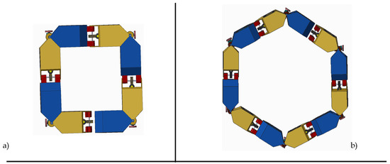 - Romanishin, J.W.; Gilpin, K.; Claici, S.; Rus, D. 3D M-Blocks: Self-reconfiguring robots capable of locomotion via pivoting in three dimensions. In Proceedings of the 2015 IEEE International Conference on Robotics and Automation (ICRA), Seattle, WA, USA, 26–30 May 2015; pp. 1925–1932. [Google Scholar]
