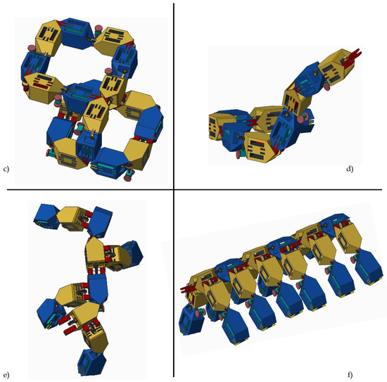 Coordinated structures using HexaMob (a) Square structure (Top view); (b) hexagon structure (Top view); (c) 3D stacked Square structures; (d) chain structure—snake; (e) biomimetic structure—Vertebrates (Top view); (f) biomimetic structure—Centipede.