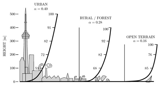 For each environment, a 3D spatial WVF was generated with the help of the CFD software WindStation using a single wind vector seed to populate the entire control volume based on the interaction with the terrain and the building topography. The wind seed direction was a uniformly random integer between and . The wind seed magnitudes were produced based on the approximation that wind magnitude follows a Weibull probability density function [53] with a shape value of two and a scale of , where the mean wind velocity , for Vancouver is 3.61 m/s (averaged annually) [54]. The WVF resolution was set equal to the terrain’s nodal resolution of 50 m to negate any computational time required for interpolation between nodes. The WVF was generated using the k-epsilon turbulence model with surface roughness set to 2 m and the max residual set to .