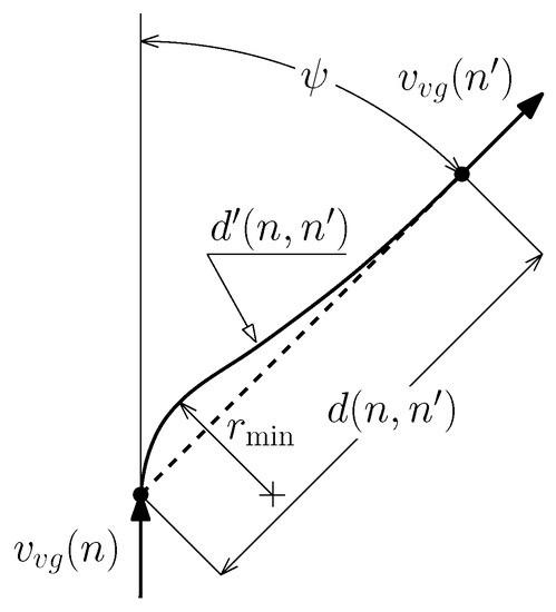 The theoretical energy required to change orientation is negligible compared to that of forward motion for highly dynamic manoeuvring UAVs. Conversely, airships are typically under-actuated and under-powered and thus have large turning radii. This results in longer paths and increased flight times between two points. The additional time to travel between two points depends on two factors: the ratio of the minimum turning radius over the distance between nodes, , and the magnitude of the orientation change, . Figure 3 shows an example of an idealized kinematic reorientation that takes into account the minimum turning radius. The true distance, , is the arc length of the two tangent arcs; the first is tangent to with radius , and the second is tangent to both the first arc and . The orientation ratio, o, is the ratio of the true distance over the idealized straight line distance, .