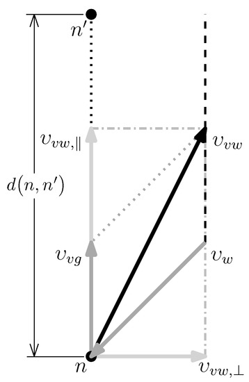 Wind is added to each node n according to the sum of WVF and gusts, but assumed to be constant in between nodes. If the vehicle is to arrive at the next node , the vehicle’s ground velocity, , must be parallel to the unit vector direction to that node, . Thus, the perpendicular components of the wind, , and the vehicle velocity relative to the wind, , must be equal and opposite. The parallel component of the vehicle’s relative velocity, , can then be optimized for the time and energy objectives depending on the current flight conditions. The components of the vehicle velocity vector relative to the ground and to the wind are shown in Figure 5.