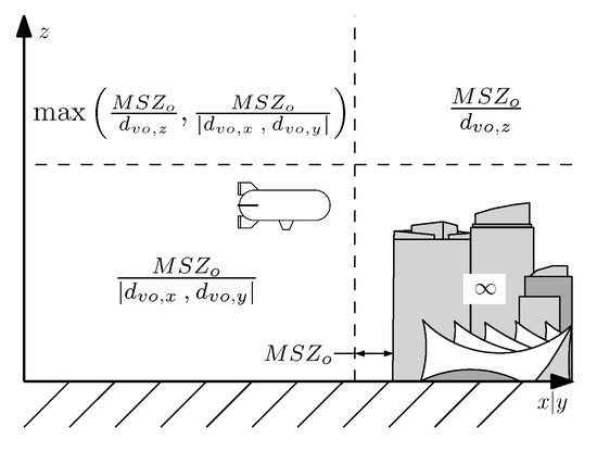 where are the distances between the vehicle v and the terrain l, altitude ceiling m and blocks of buildings o, along the x,y,z axis in Cartesian coordinates. The selection of the avoidance term depends on the vehicle position with respect to the obstacle. As an example, the second term of (17) would be used for the vehicle position shown in Figure 6.