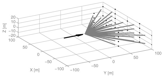 Once a multi-objective cost function field is formulated, the desired trajectory through the field is determined using 3D grid search techniques. A terrain map nodal list is generated based on an rectangular grid representation of 2 km × 2 km × 1 km with a nodal resolution of 50 m × 50 m × 10 m for a total of nodes. This resolution was chosen because it is roughly the same as 0.75 arc-sec digital elevation maps that are publicly available from GeoBase. To reduce the computation time, the connections between nodes are generated using the vector neighbor operator [5]. It provides an average horizontal angle increment and allows for flight path angles of some predetermined values to connect successive path nodes as they may not lie within adjacent grid cells. This technique avoids the exhaustive search within all the nodes and provides a better scalability to the search space. As it is illustrated in Figure 7, the black arrow represents the UAV direction while the gray lines represent possible UAV directions (assuming that the nodes exist and are not outside the search environment). Redundant connections are eliminated (for example, [2, 2, 2] is excluded because it is a multiple of [1, 1, 1]). Furthermore, connections that create an angle greater than the critical turning or pitching angles of the UAV described in Section 3 were also omitted.