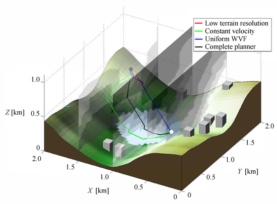The maximum computation time for a single trial of the complete planner was 78 s. It is worth noting that the WVFs were loaded from a calculated a priori database. Hence, uploading variable WVFs’ data using CFD computations in the physical UAV may lead to an additional overhead and so to a slight increase in the processing time. However, it was observed that the WVFs for these trials were calculated in 60 s, on average, and never more than 90 s using WindStation Version 4.0.1. The resulting total computation time to calculate the CFD WVF plus the trajectory over the 2 km × 2 km × 1 km control volume would still be only a fraction of the predicted flight time to traverse the trajectory. Since the trajectories can be planned faster than they can be followed, it is reasonable to conclude that the proposed complete trajectory planner could be used for unmanned airships. Depending on the desired resolution and on-board processing capabilities, it is foreseeable to include temporal and spatial WVF generation into the re-planning process or equipping the UAV with a local planner to find optimal paths within regions where obstacles are detected and re-planning is required, for instance. CFD-generated WVF data could also be fused with national weather service predictions (when available) and UAV-generated wind measurements for added certainty.
