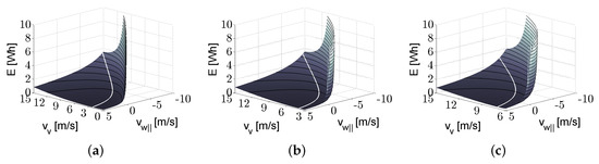 To further illustrate this effect, a case study was conducted to highlight the function selecting the vehicle velocity to minimize the energy consumption defined in (11). Consider the vehicle flying horizontally over a straight line distance of 100 m, with varying amounts of parallel and perpendicular wind components, and = 0, 3, 6 m/s, respectively. If these wind components are known, the vehicle velocity, , can be chosen to minimize energy, as shown by the white line on each surface in Figure 9. Clearly, since the line in each graph is nonlinear, the desired vehicle velocity for minimal energy consumption is not constant and should be included in the planning process. Furthermore, Figure 9 shows that the optimal vehicle velocity is never zero even in the presence of a pure tail wind due to the non-negligible constant power required to maintain the on-board electronics.