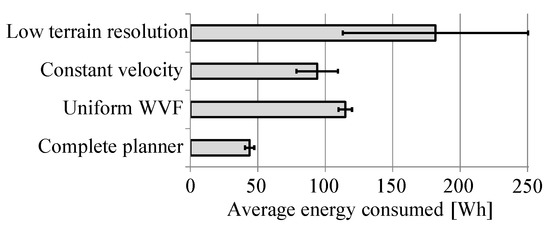 Figure 10 shows the average energy consumed for each planner with a 95% confidence interval. The improvement in performance between the complete and the other planners was greater than the error in performance caused by the random gust wind component. Therefore, the inclusion of all three key factors to UAV trajectory planning yielded a significant improvement.