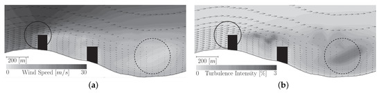 The trajectory planner uses wind speed and direction to optimize the vehicle velocity and path. Therefore, incorporating turbulence intensity data into the path planner may further optimize the generated path. It is known that turbulence flows persist long into the wake of a disturbance. Although their intensity is low, it may have a detrimental effect on the flight performance. As an example, this means penalizing areas with relatively high turbulence intensities, such as the one circled in a solid line in Figure 11a, and rewarding the others with low turbulence intensities, like the one circled in a dashed line. The CFD software WindStation, used to generate WVFs, also produces the turbulence intensity fields, shown in Figure 11b. These data could readily be incorporated into the objectives in the cost function. However, platform-specific experimental flight data would be required to fully realize the impact of turbulence intensity on the flight performance and to properly utilize the turbulence data for trajectory planning. In addition to turbulence, thermal effects could also be included in the generation of the WVF generated by the CFD software to account for the vertical wind components produced by thermal convection [55].