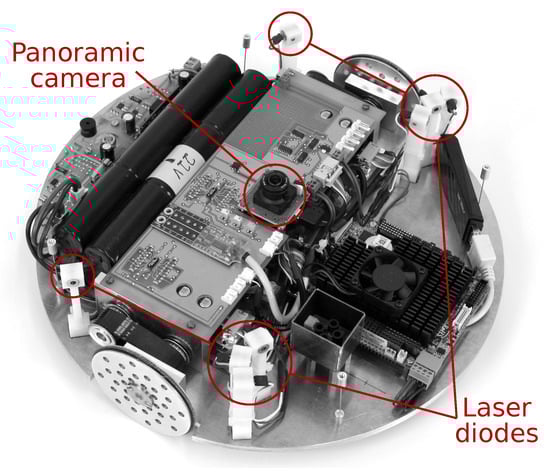 Our cleaning-robot prototype, as used in this work. With its round shape, size (radius , height ), and pair of separately driven wheels, it strongly resembles commercial cleaning robots. A center-mounted camera captures panoramic images of the surroundings, which are primarily used for navigation. The camera also measures ranges to obstacles using the laser dots created by the laser diodes. This picture shows the robot without its cover.