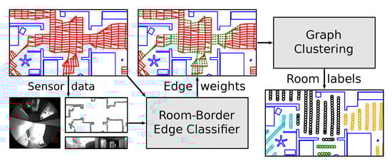 Our solution follows the general procedure depicted in Figure 2. After preprocessing the map (Section 2.1.1), we employ supervised machine learning to identify those map edges that cross room borders: first, we build a feature vector for each map edge based on sensor data recorded in its vicinity, as well as the map information (Section 2.2). A Support Vector Machine (SVM) [,] classifier then identifies room–border edges based on their feature vectors (Section 2.3). In order to learn human criteria for room borders, we train the classifier on human-annotated training data. However, simply segmenting the map graph at these room–border edges would be vulnerable to misclassified edges. Instead, we apply graph clustering, which identifies clusters of tightly connected nodes (Section 2.4). Each of these clusters is assigned a label, which then corresponds to the room label of the nodes within the cluster. Specifically, we minimize the normalized cut through spectral clustering [,]. Here, we encourage spectral clustering to cut the identified room–border edges by assigning them a lower weight. This makes it more likely that minimizing the normalized cut results a human-like room segmentation. Since graph clustering attempts optimize the segmentation across the entire graph, the result is more robust against the effects of occasional misclassified edges. Note that spectral clustering requires a prespecified number of clusters. Although we generally assume that this room count is known (for example by querying a human user), we also try to estimate it from the map (Section 2.4.1).