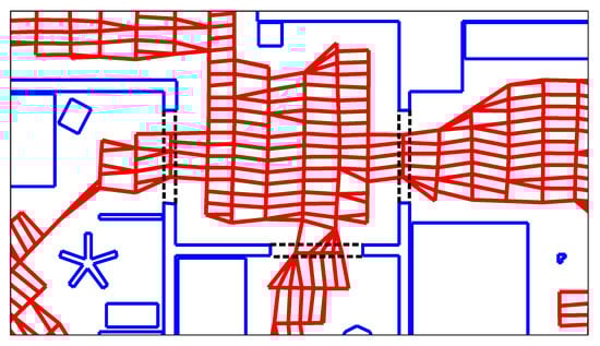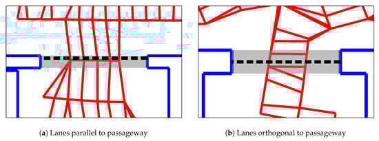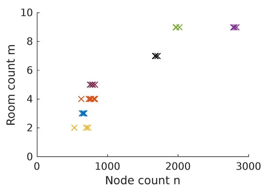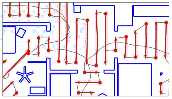 Figure 6 demonstrates that the number of edges cut by a room border depends partly on the orientation of the lanes. This is due to the difference in node and lane spacing: the nodes on each lane are placed approximately 10  apart. In comparison, the distance between lanes is . Thus, a cut that runs parallel to the lanes crosses an edge every . Conversely, edges are cut at  intervals when cutting orthogonal to the lanes—for example, the number of cut edges in Figure 6a is greater than in Figure 6b, depending on whether the robot drove lanes that are parallel or orthogonal to the passageway.