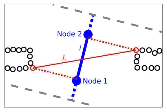 An illustration of the passageway-width estimation. Obstacle points are shown as black circles. The two blue dots represent to the two nodes in the map graph; they are connected by an edge (blue line) of length l. A pair of dashed gray lines delimit the obstacle search area around the edge. Two red circles correspond to the two obstacle points closest to the edge on each side, as shown by the dotted lines. The distance L (red line) between those two points is the approximate passageway width.