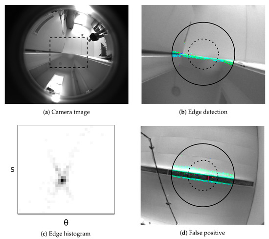 An illustration of the visual passageway detection heuristic. Passageway detection on the camera image from (a) identifies the edges shown in the detail (b); (b) corresponds to the dashed rectangle in (a). The solid outer ring represents the edge–search cone with an opening angle of . Similarly, the dashed ring corresponds to the edge–offset cone with an angle of . Pixels identified as part of an image edge are highlighted in color. The hue indicates the direction of each pixel’s edge gradient. Next, we construct an edge-pixel histogram from these pixels based on the edge direction  and edge offset s. The histogram in (c) shows a clear maximum near the center, corresponding to the lintel. However, this simple heuristic is vulnerable to false positives. In (d), such a false positive is caused by a ceiling lamp.