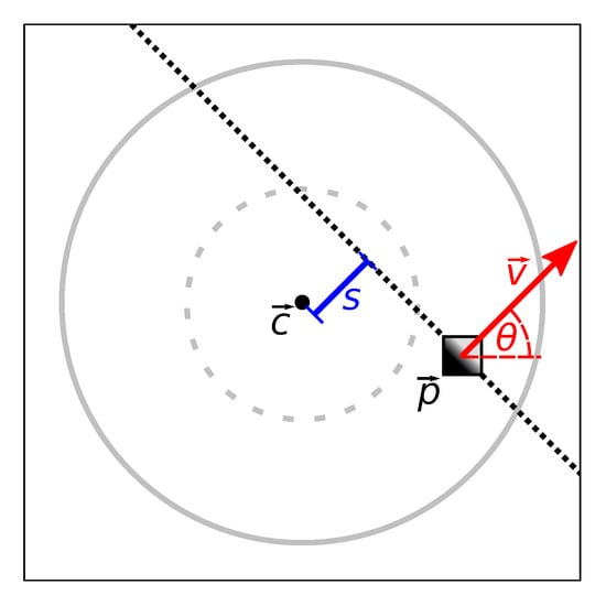 The geometry of the edge pixels for passageway detection. The position  contains an edge pixel with gradient vector  and edge–gradient orientation . Mentally extending the edge from  gives the dotted black line. If the pixel is part of a straight lintel, the lintel would correspond to this line. The distance between the line and the image center  is the edge offset s. The gray circles correspond to the search cones shown in Figure 8b. If  lies within the outer search cone, and s is less than the radius of the inner search cone, this pixel will be added to the histogram.