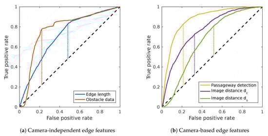 In Section 2.2.5, we tried to predict the usefulness of the edge features, using the ROC curves shown in Figure 11. We already noted that this is merely a coarse heuristic. Some limitations of this approach become clear when comparing it to the edge-feature experiments: in Table 3, there are notable differences in the area-under-curve and J of the various edge features. However, removing only one type of edge feature merely causes a small increase in the mean impurity . This is shown in the no-ceiling, no-pano or no-obst experiments in Table 10. In contrast, removing both the visual passageway-detection and image distance features greatly increases . We failed to predict this behavior based on the ROC analysis alone. We also used ROC analysis to optimize the visual passageway-detection parameters in Section 2.2.3. Due to the limitations of the ROC-based evaluation, it is possible that other parameters would actually lead to better room segmentation results. However, a combined optimization of the passageway-detection and room segmentation parameters would be extremely time-intensive, and is therefore not attempted here.
