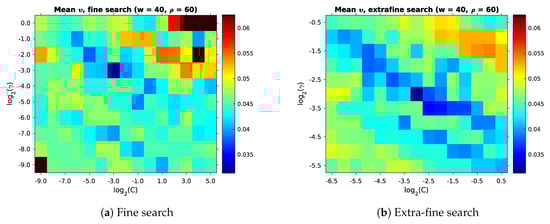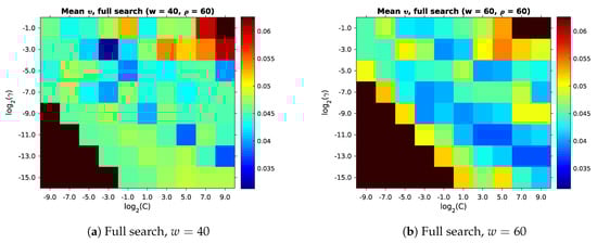 Table 10 shows a very high  for the no-ceiling experiment. As explained in Section 2.3.4, we wish to avoid such high values of C. Initially, we used the basic search space listed in Table 4, for which . Using this search space, we achieved a lowest mean impurity of . However, the  plots from this search showed that  is further decreasing as C increases. Due to the high mean impurity, we decided to extend the search space accordingly. The resulting no-ceiling search space is included in Table 4. This extended search does indeed result in the lower  shown in Figure 26. Still, we decided not to extend the search space towards  for the other edge-feature experiments: while lower  might be achieved this way, the computational cost is very high. Even when distributed across 40 modern CPU cores, covering this extended search space takes several days. The  plots of the other experiments also do not hint at improvements in  for these very large values of C.