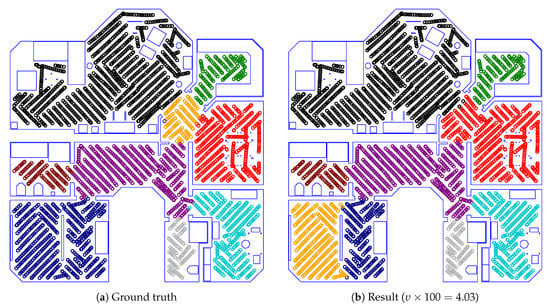 A room segmentation result from the additional simulated environment. The style is identical to that of Figure 22. As seen in (b), our method failed to identify the wide passageway separating the upper-left room. However, all other rooms were segmented correctly.