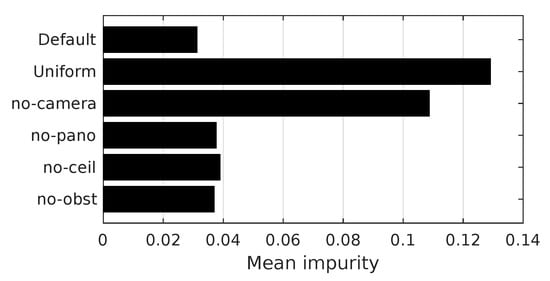 Figure 26 shows that camera images are useful for our room segmentation method:  remains low if the image distance (Section 2.2.4) or visual passageway-detection (Section 2.2.3) features are available to the classifier. One or both of these features are present for the no-pano, no-ceiling, and no-obst experiments. In comparison, the passageway width derived from the obstacle data (Section 2.2.2) is less useful: without this edge feature,  increases only slightly, as shown in the no-obst experiment. Conversely, using only the passageway-width and edge-length features results in a high ; we demonstrate this in the no-camera experiment.