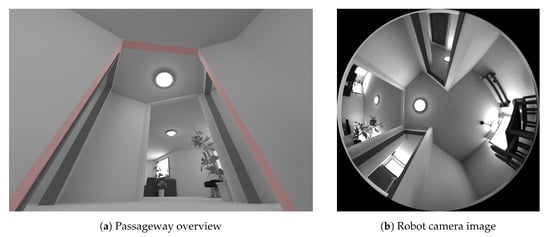 To detect edges, we now apply a Scharr operator to the search area, which is similar to the well-known Sobel operator. However, the Scharr operator is specifically optimized for rotational invariance [,]. This property is useful, as we wish to detect edges independent of their orientation within the image. In our experiments, we use the implementation from the OpenCV library []. We now know the horizontal and vertical gradients  and  for each pixel within the search area. Next, we construct the edge-pixel gradient vector  from these values. For passageway detection, light-dark and dark-light edges should be treated equally. We therefore use a definition of  that is invariant to an inversion in pixel intensities: