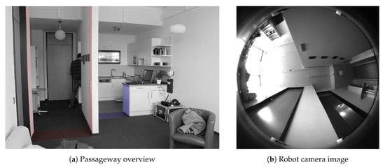 In the environments considered in this work, room borders commonly occur at passageways. We therefore wish to detect passageways in the images recorded by our robot’s on-board camera. In the literature, there are numerous methods for visually detecting doors, for example by Chen and Birchfield [], Murillo et al. [], Yang and Tian []. These methods usually attempt to detect doors from afar, for example to guide a robot towards them. As mentioned before, our map lacks global metric consistency. After detecting a distant door, we are thus unable to estimate its location in our map. Subsequently, we also cannot determine which edges cross through such a doorway. We therefore decided to use a simple heuristic instead. This method merely checks for passageways in close proximity to each map node. To estimate whether an edge crosses a passageway, we then combine the results from the edge’s two nodes.