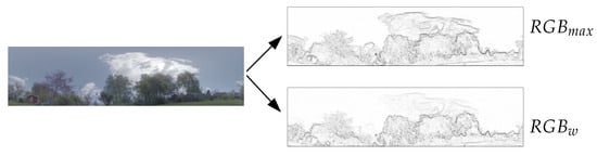 Previous studies [16] showed that MinWarping performs best on edge-filtered images with respect to illumination tolerance; however, standard edge detection algorithms lead to prominent edges in the sky caused by clouds. The proposed method is illustrated in Figure 1: As can be seen, the Prewitt filter applied to standard RGB channels followed by a maximum operation produces an edge image with distinct edges in the sky, whereby the proposed method (denoted as ) leads to an edge-filtered image in which the edges in the sky are substantially fainter.