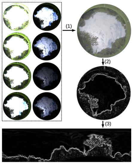 - : Prewitt filter as in , but followed by a sky blackening similar to the approach in [48,49], but using the widespread thresholding method proposed in [61]. The adaptive thresholding was customized to handle panoramic images by weighting the pixels within a column to reduce errors from contortions (the details are given in the Appendix).