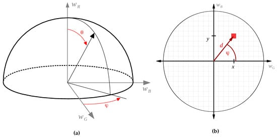 This parameterization spans a parameter space formed by the surface of a hemisphere with radius one. In Figure 3a, this parameter space is sketched. The angle controls the weight for the red channel in the linear combination; results in in the linear combination; and results in . The choice of the angle controls the ratio of the green and blue channels. Note that the other hemisphere is a center-symmetrical copy, as only the edge sign changes (which is eliminated by the edge magnitude computation using the Prewitt operator).