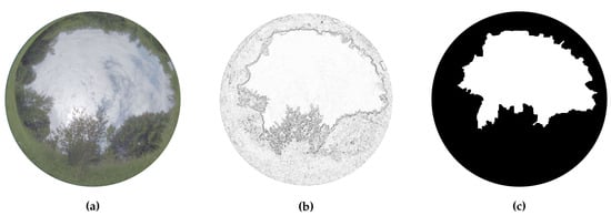 Example image for analysis of the sky-to-ground ratio: (a) input color HDR image; (b) edge-filtered image; (c) mask image: the ground region is shown in black, and white represents the sky region. The image is taken from the database Finnbahn and edge-filtered using the method.