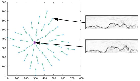 Example of MinWarping experiments: One image (location marked in purple) is selected as the snapshot, and all other images are used as current views (blue). The computed home vectors are shown as green arrows. This example shows the setup of the Finnbahn database with images preprocessed using the method (). The edge-filtered images are shown with inverted colors for better visualization.