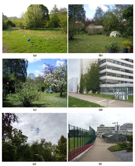 Database environments: The images show the different environments in which the six databases were collected. The databases cover diverse environments under a wide range of dry weather conditions. (a) Finnbahn; (b) Garden 1; (c) Garden 2; (d) university; (e) balcony; (f) route.