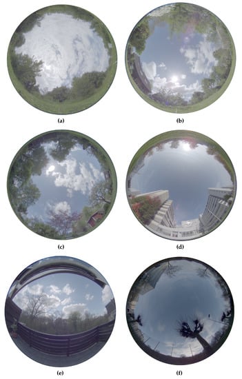Exemplary panoramic HDR images for each database. (a) Finnbahn; (b) Garden 1; (c) Garden 2; (d) university; (e) balcony; (f) route.