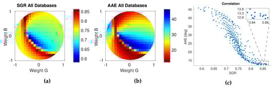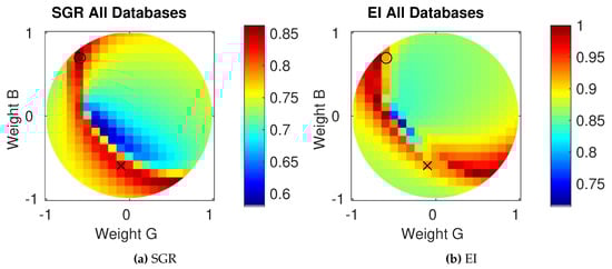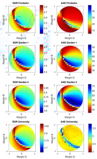 In this section, we describe and discuss the results of different linear combinations regarding the SGR criterion (see Section 4.1) based on the databases described in Section 5.1. In Figure 8a, the SGR criterion is shown for the chosen gridded samples of linear factors averaged over all 464 images (Equation (8)). The diagram reveals a maximum of the SGR criterion near the circumference, which corresponds to a small weight for the red channel. The optimal weights are for the red channel, for the green channel and for the blue channel (marked by a ⚬ in the figures).