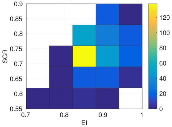 Additionally, in Figure 8b, the EI-criterion is plotted for the sampled linear combinations. Based on this plot, the above choice of , and is justified by the fact that the EI-criterion indicates a strong edge response in the related region. Altogether, high SGR values do not co-occur with low EI values, but low values of EI coincide with low values of SGR. This is additionally illustrated in Figure 9 in the form of a bivariate histogram of SGR and EI values. This diagram is based on the SGR and EI values for the sampled parameter combinations averaged over all databases. Most common is the co-occurrence of average EI values with average SGR values. Important is the upper left part, which shows that high SGR values do not co-occur with low EI values. Moreover, the highest SGR values co-occur with average or high EI values.